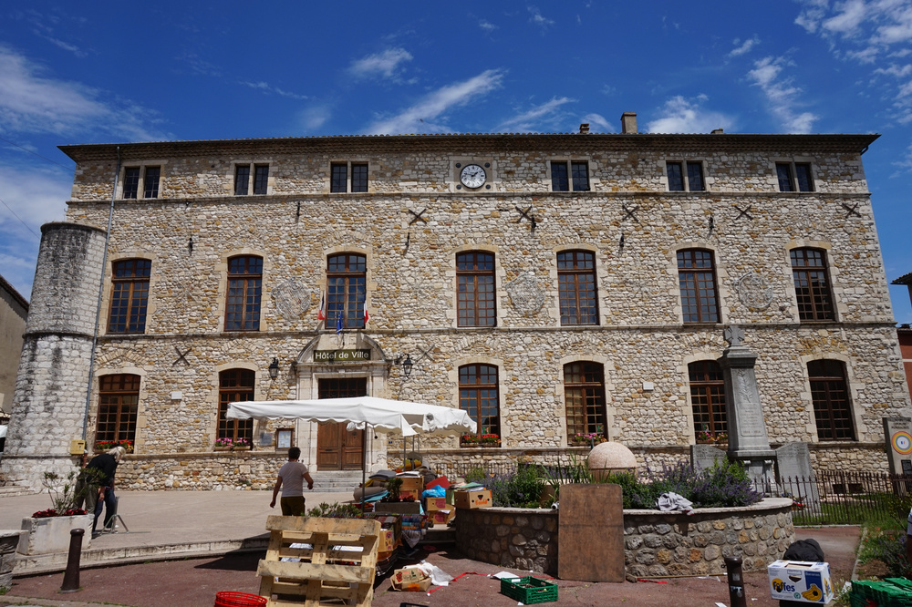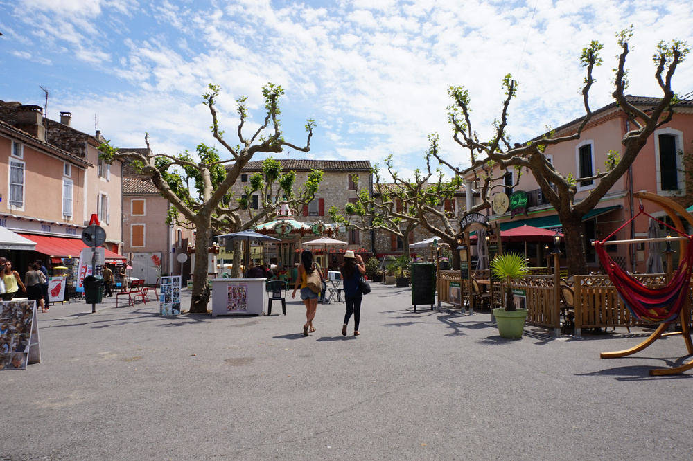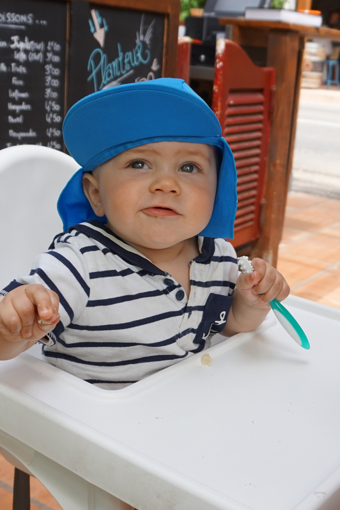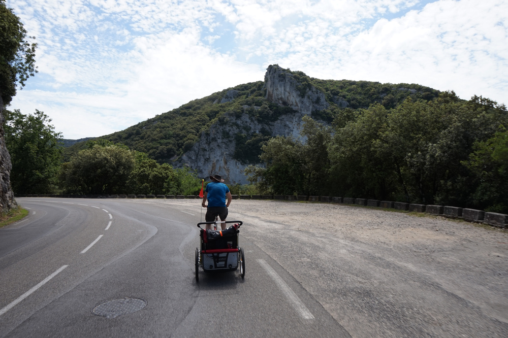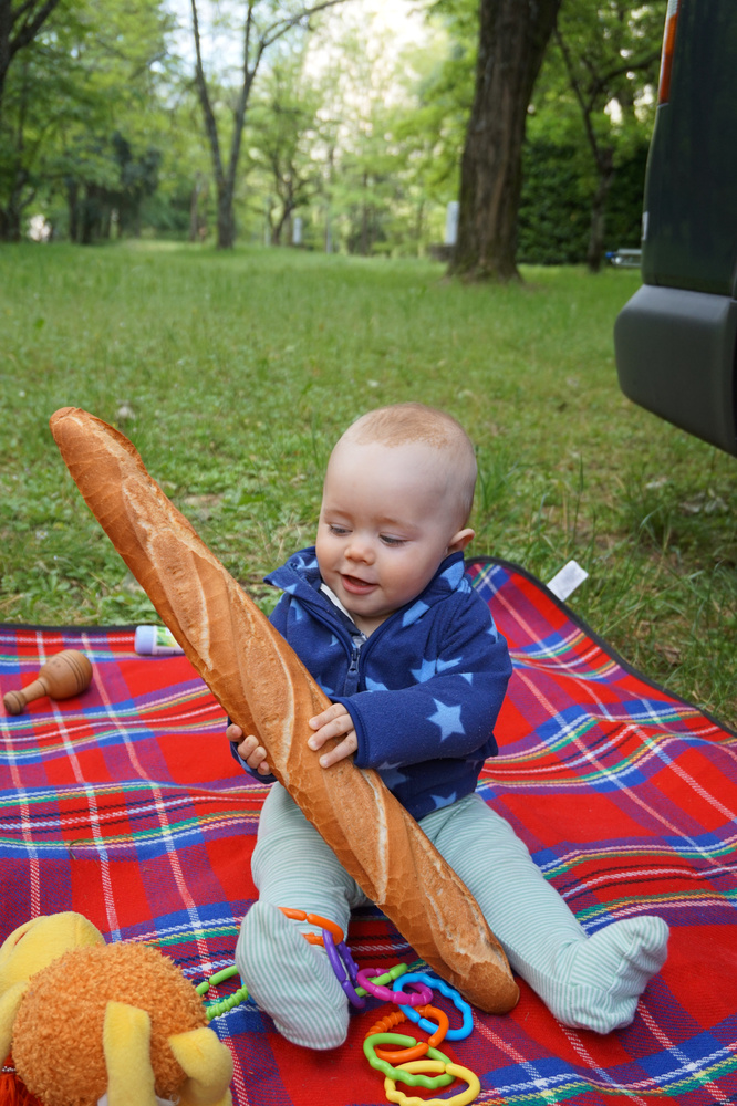 Am nächsten Morgen gibt es Baguette zum Frühstück. Wir satteln die Räder und machen uns auf den Weg zum Supermarkt. Irgendwie hatte meine romantische Erinnerung den in unmittelbarer Nähe zum Campingplatz verortet. Naja 5,5km sind nix f̈́ür unser Gespann und wir erwischen noch das Ende vom Donnerstagsmarkt in Vallon Pont D’Arc. Dort bekommen wir fast alles, was wir im Supermarkt kaufen wollten, so dass Bérénice nach einem kurzen Einkauf wieder da ist und wir Yilian seinen Mittagsbrei auf dem Parkplatz des Supermarktes geben. Bon Appetit!