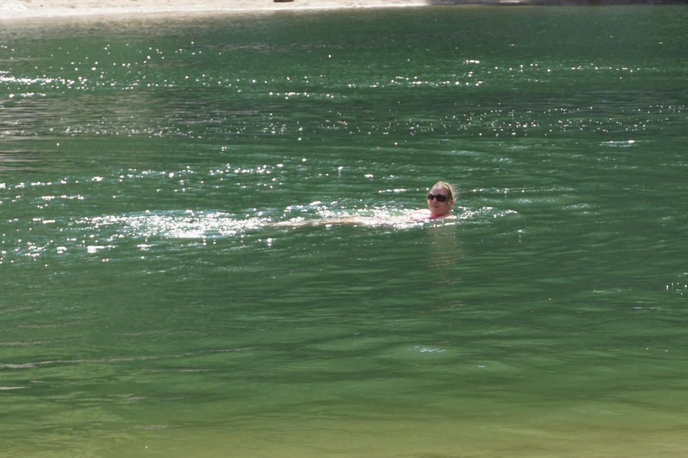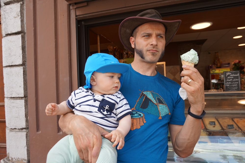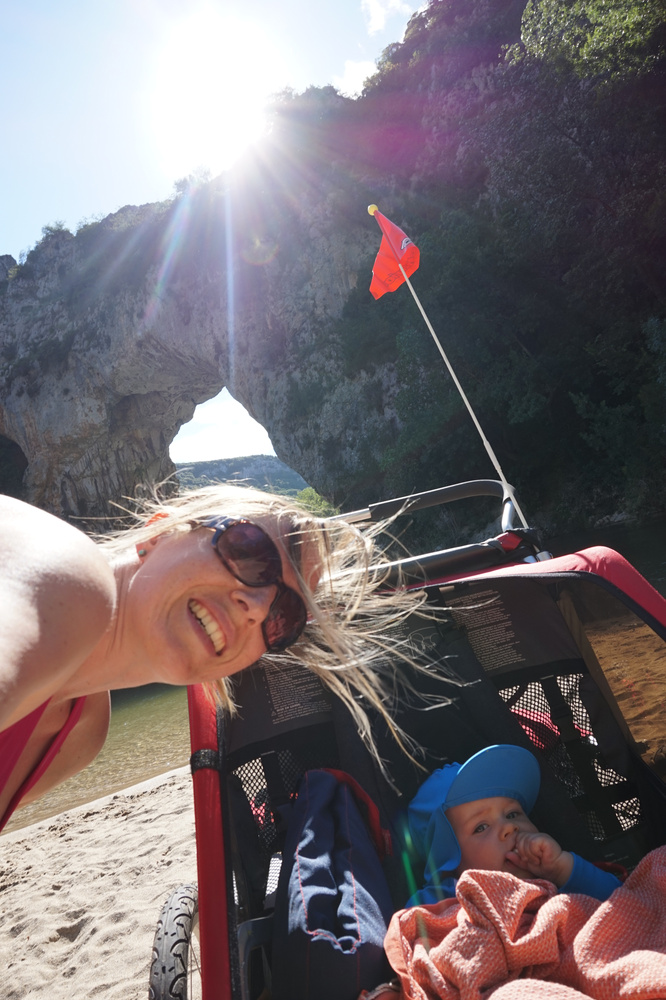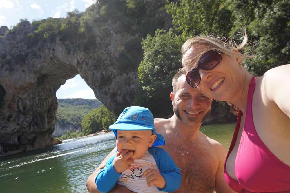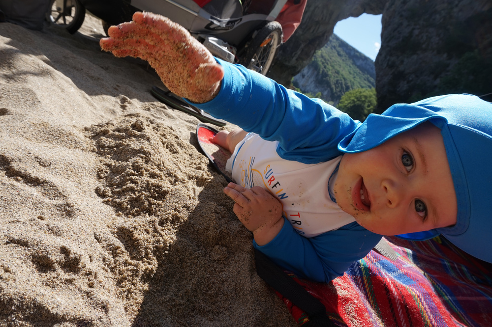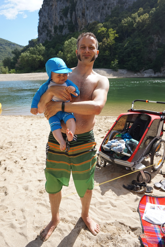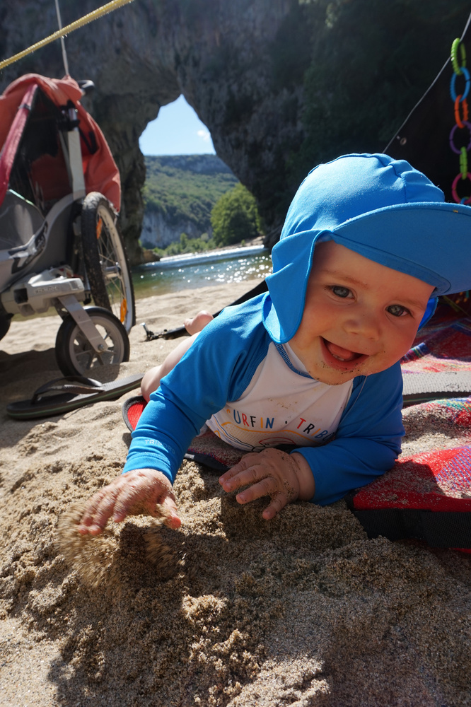 Zurück am Campingplatz wird erstmal gebadet. Mama und Papa schaffen es einmal komplett in die Ardeche zu tauchen. Baby Yilian zieht beleidigt die Füsse hoch, wie wir ihn in den Fluss tauchen wollen. Er spielt lieber mit dem Flusssand und probiert ob der wirklich nicht schmeckt, so wie seine Eltern das vorher behauptet haben.