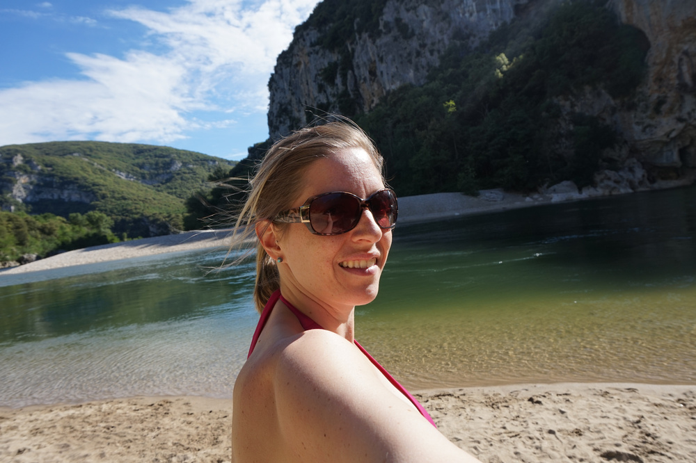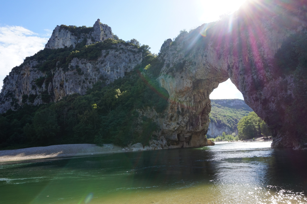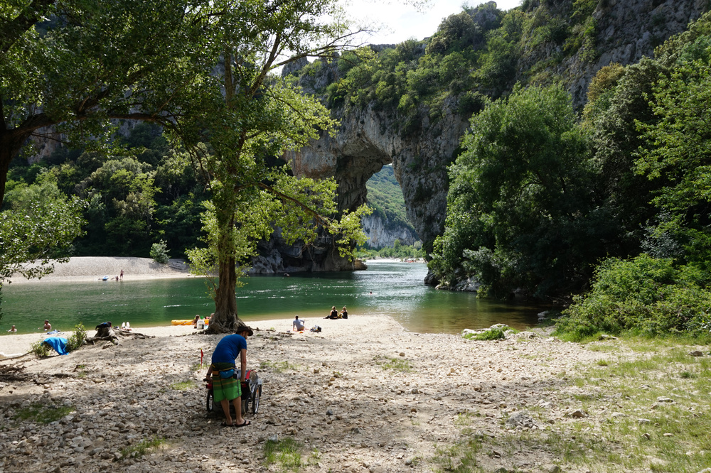 Heute Morgen nach dem Frühstück wurden Yilian und ich aber dann zur Überraschung geführt. Ein Weg führte zum Strandufer der Ardèche. Das hellblaue, klare Wasser des Flusses schlängelte sich an unserem hellem Sandstrand vorbei, und hatte sich vor Millionen (?) von Jahren durch den Berg gedrängt. Nun dürfen wir und viele Kanufahrer sich der tollen Sicht erfreuen, und sich inmitten der Felsen ganz klein fühlen.