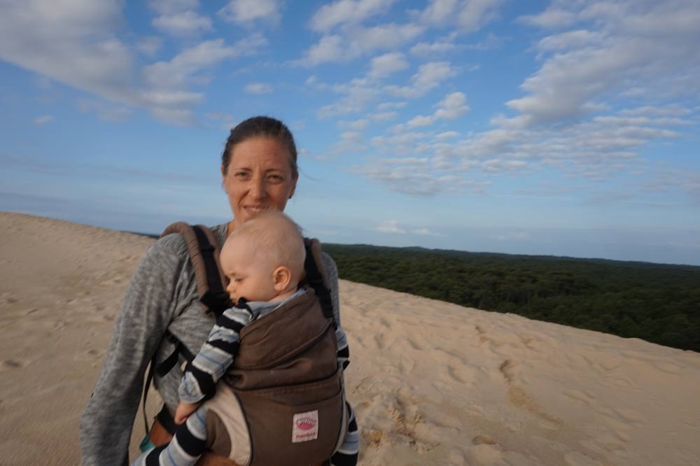 Auf der Mitte kann ich nicht mehr, und frage mich, warum ich das Kind trage, und was zur Hölle ich hier eigentlich tue, aber wir sind schon auf der Höhe der Baumkronen. Zu hoch, um zurückzugehen. Ich schnaufe weiter bis nach oben und sehe, dort ist nicht wie erwartet der Weg zum Meer. Sand, Düne, Sand und irgendwo da unten ist der Bassin - alles ist in das warme Licht der Abendsonne getaucht. Wir sind an einem der schönsten Orte der Welt gelandet.