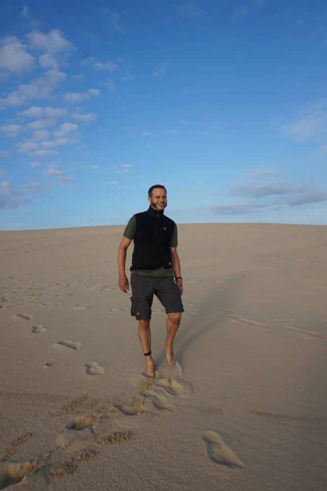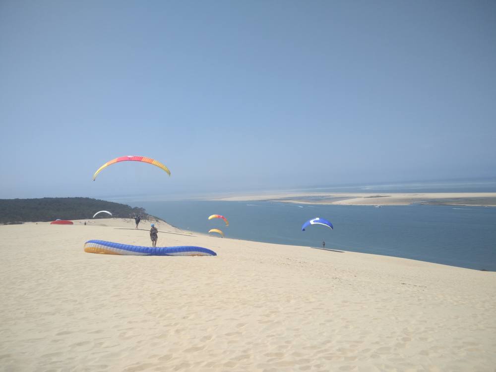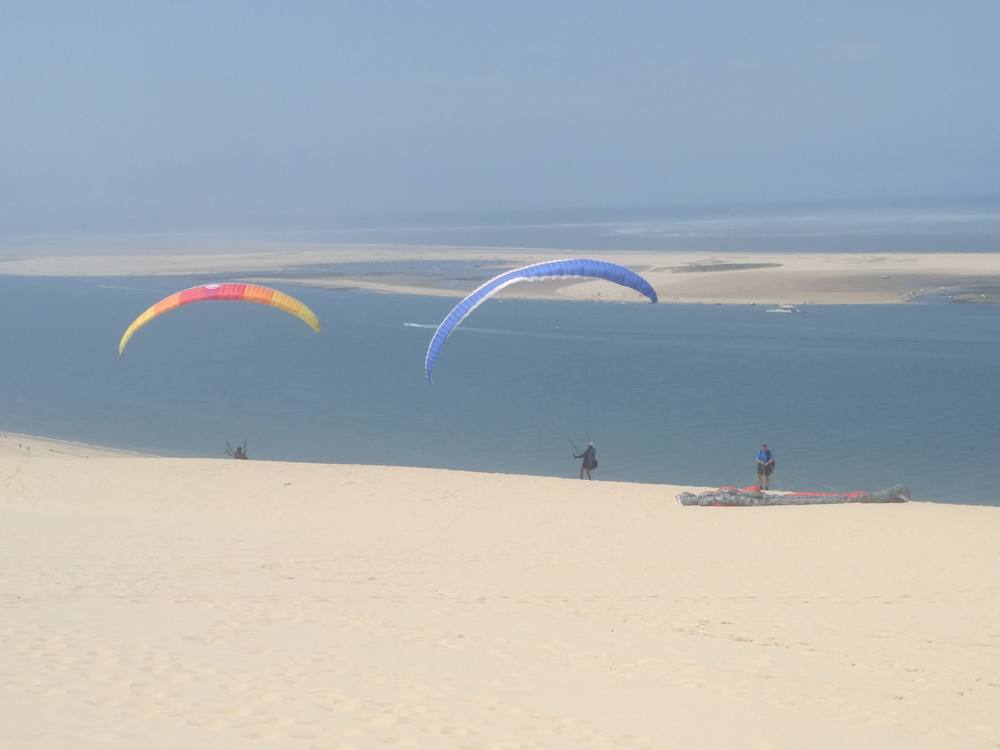 Wir müssen unsere Wanderung nach einer Weile geschreibedingt abbrechen, nur versperrt uns dieser Dünenberg den direkten Zugang zum Campingplatz. Na wir haben ja die Wanderstöcke dabei. Und wieder lohnt es sich, es ist ein wunderbarer Blick, dieses Mal auch auf die Gleitschirmflieger, durch deren Flugbahn wir stapfen. Nichts für ungut.