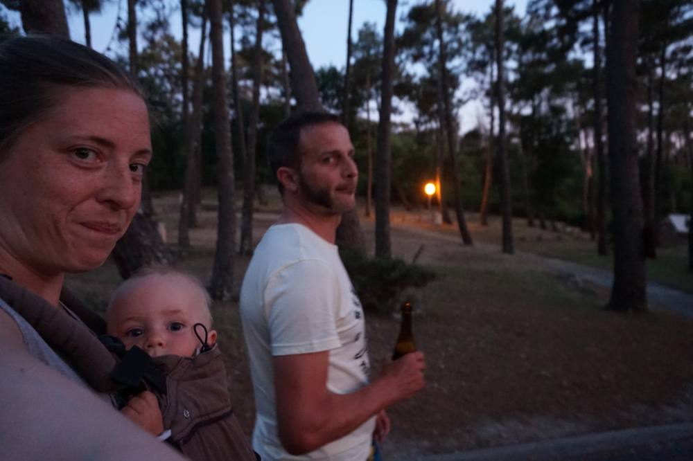 Unser Ort besteht nur aus 3 Campingplätzen. Wir fahren am ersten vorbei und Matthias schreit auf: “Alter Vatter!” Am Ende des Campingplatzes scheint eine meterhohe Düne durch die Bäume. Das hatten wir nicht erwartet. Genauso ist es beim nächsten und unserem Campingplatz. Wir checken schnell ein, suchen uns einen strategisch guten Platz und laufen los zu diesem riesen Sandberg. Wie der Ochs vorm Berge, stehen wir vor der Düne. Wir sehen Fußspuren, die steil hoch führen. Ich mit Yili vor dem Bauch würde lieber um die Düne herum laufen, aber da Matthias nicht locker lässt, nehme ich das resigniert als Workout und Nervenkitzel für junge Mütter und beginne mit dem echt steilen Aufstieg.
