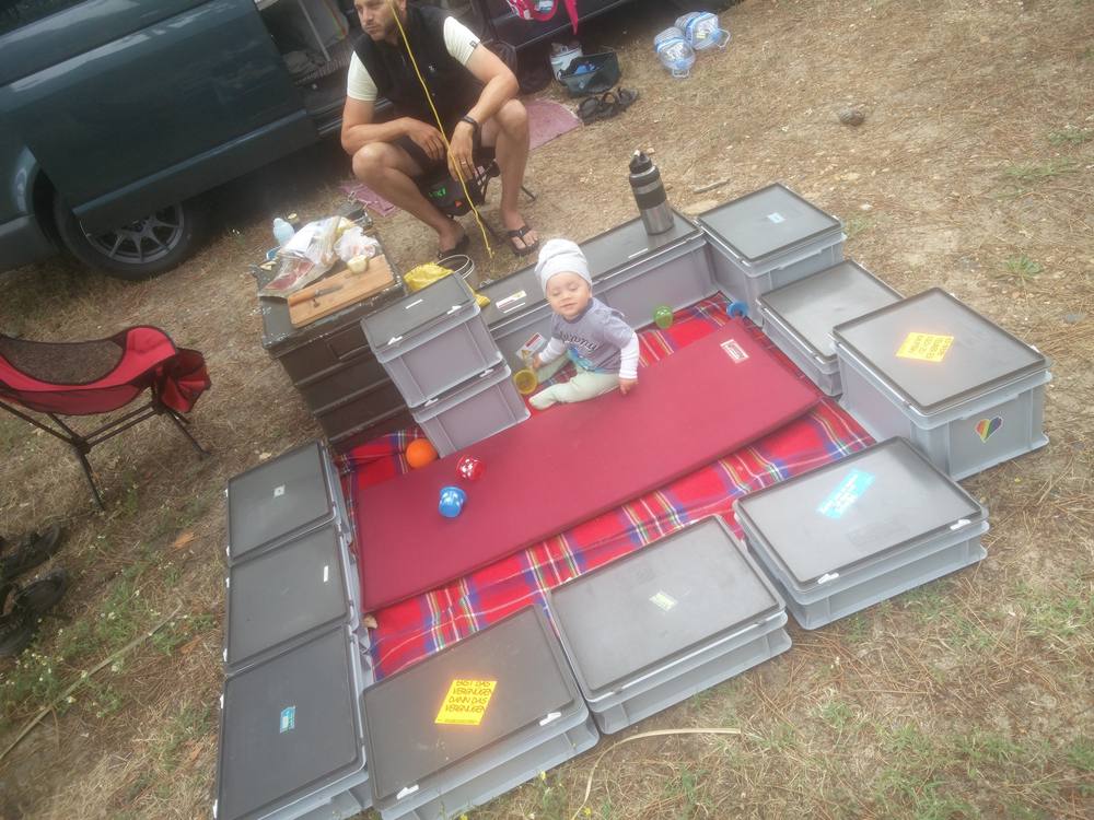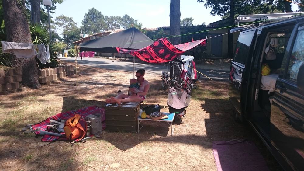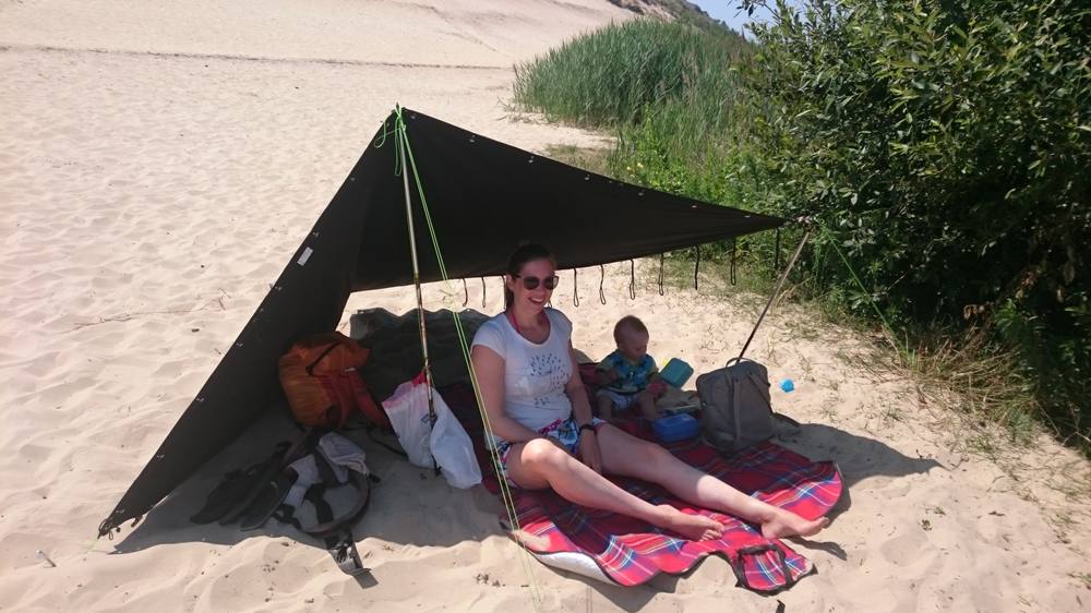 Tag 2 wollen wir am Strand verbringen. Matthias steckt wieder all seine Energie in den Bau eines Sonnenschutzes anhand eines Tarps, Strippen und Wanderstöcken. Das Baby probiert mal wieder eine handvoll Sand. Der lange Strand lädt zum Laufen ein.