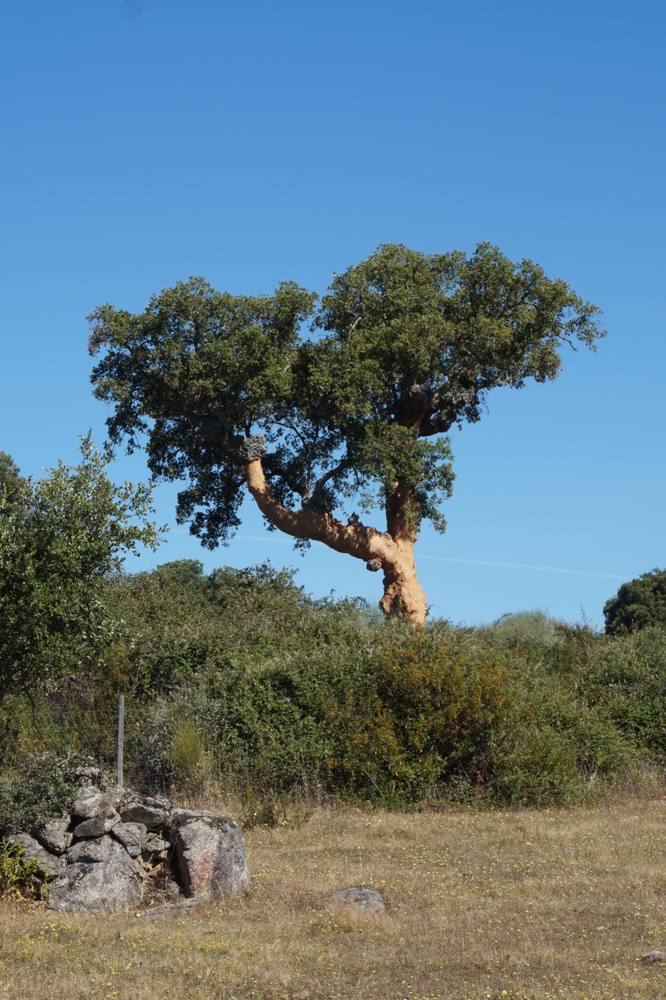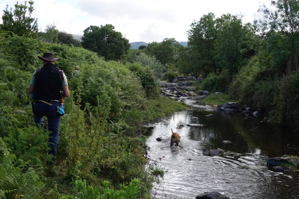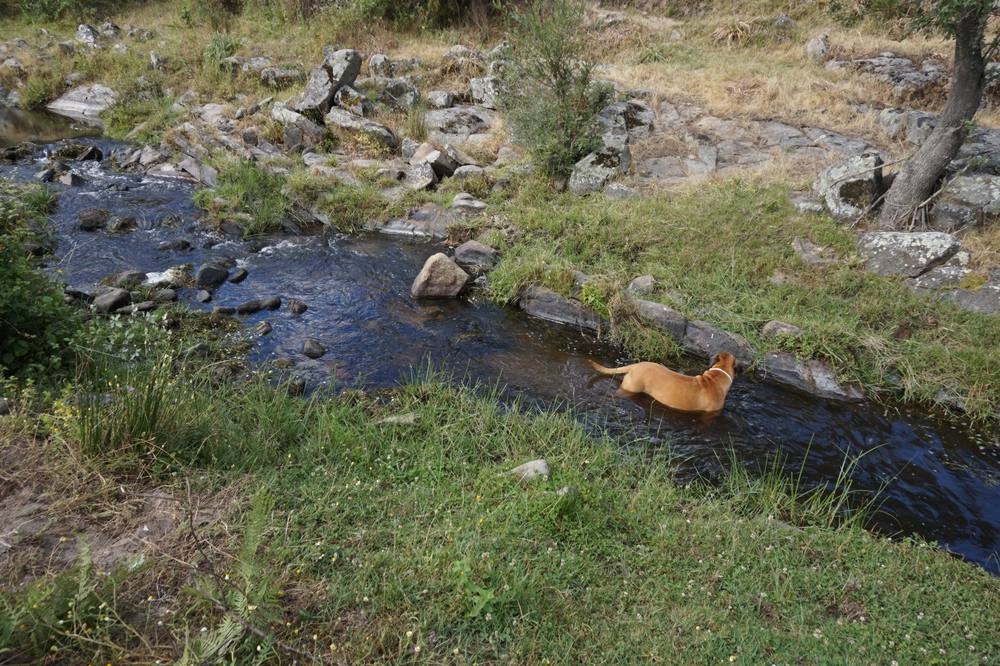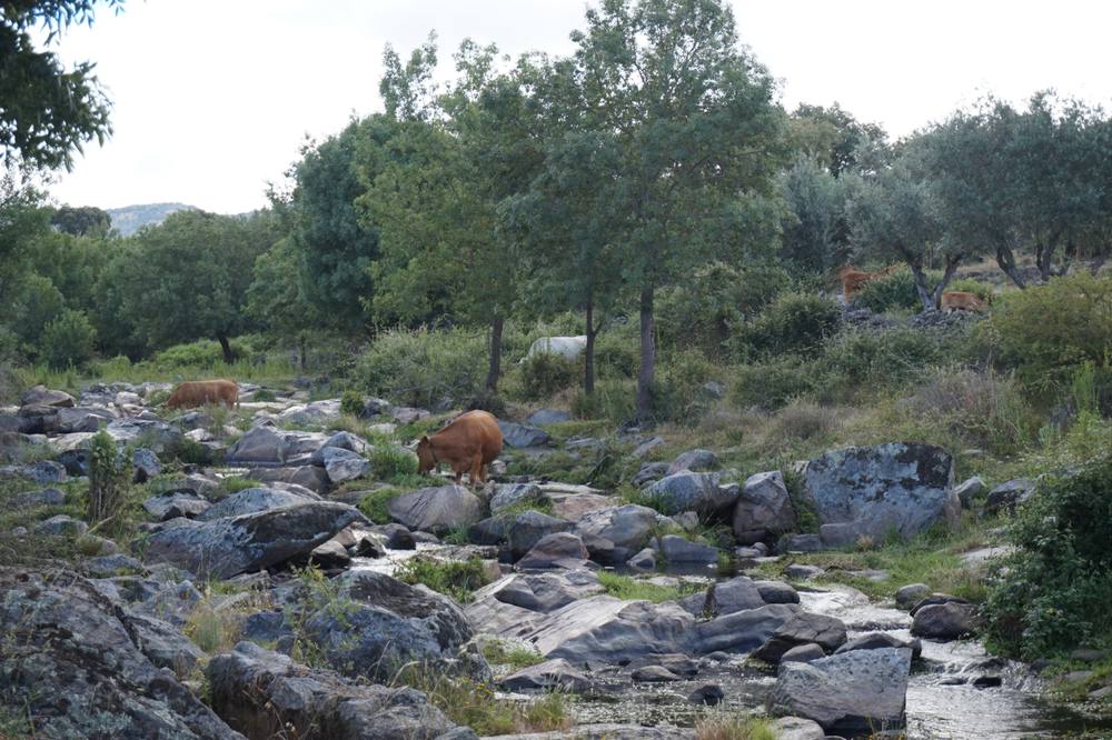 Durch Ginsterbüsche die hin und wieder von Korkeichen gesäumt werden erreichen wir schliesslich den Bach, der am tiefsten Punkt des Grundstücks fliesst. Ein Lorbeerbusch steht kurz vor dem Ufer und wir beschliessen am naechsten Tag noch einmal wieder zu kommen und Lorbeerblätter mitzunehmen.
