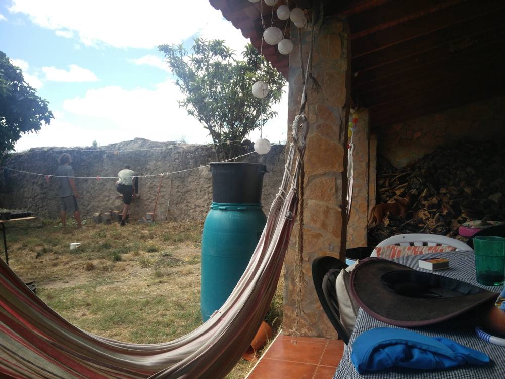 Nach der ausgiebigen Siesta helfe ich Marc beim bewässern des Selbstversorgerfeldes. Wir fangen mit den Kartoffeln an. Ehrlich gesagt ich dachte wir wollten nur die Kartoffeln bewässern. 25kg hat er in die Erde getan. Das sind einige Reihen. In jeder Reihe sind zwei Eimer Wasser nötig, die wir vom großen Faß was mit einem Schlauch aus dem Brunnen gespeist wird abfüllen. Nachdem ich zweimal Hautkontakt mit den Feigenkakteen gemacht habe, die Nadja für die Kosmetikindustrie zwischen unterschiedlichen Beete gepflanzt hat, laufe ich nicht mehr zum Faß sondern leere nur die Eimer, die Marc mir anreicht. Trotzdem bin ich, als wir mit den Kartoffeln fertig sind froh.