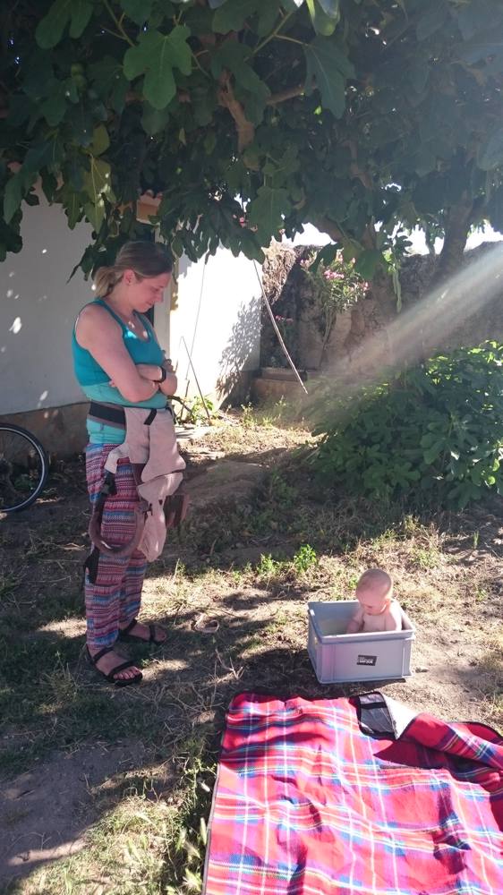 Nachmittags ist es so heiss, dass wir nicht viel machen. Wir machen einen weiteren kleinen Spaziergang. Es sitzt sich schon ganz prima auf Papas Schultern. Zurück baden wir Yilian in einer der Rakokisten.