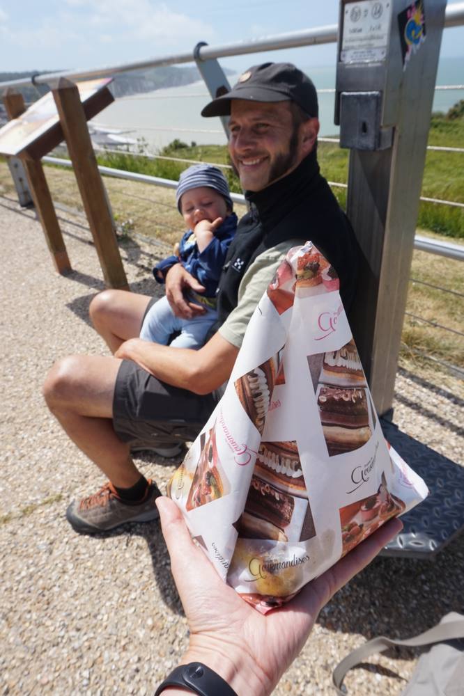 Bevor es am nächsten Tag losgeht, kaufe ich unter anderem für Matthias und mich einen Gâteau aux Pommes Normand, der wahnsinnig lecker ist mit seiner Puddingfüllung und sehr dünnen karamelisierten Apfelscheiben. Es hätte ein Stück für zwei Personen gereicht, dann hätte ich vielleicht auch nicht noch mal den Berg hochradeln müssen…