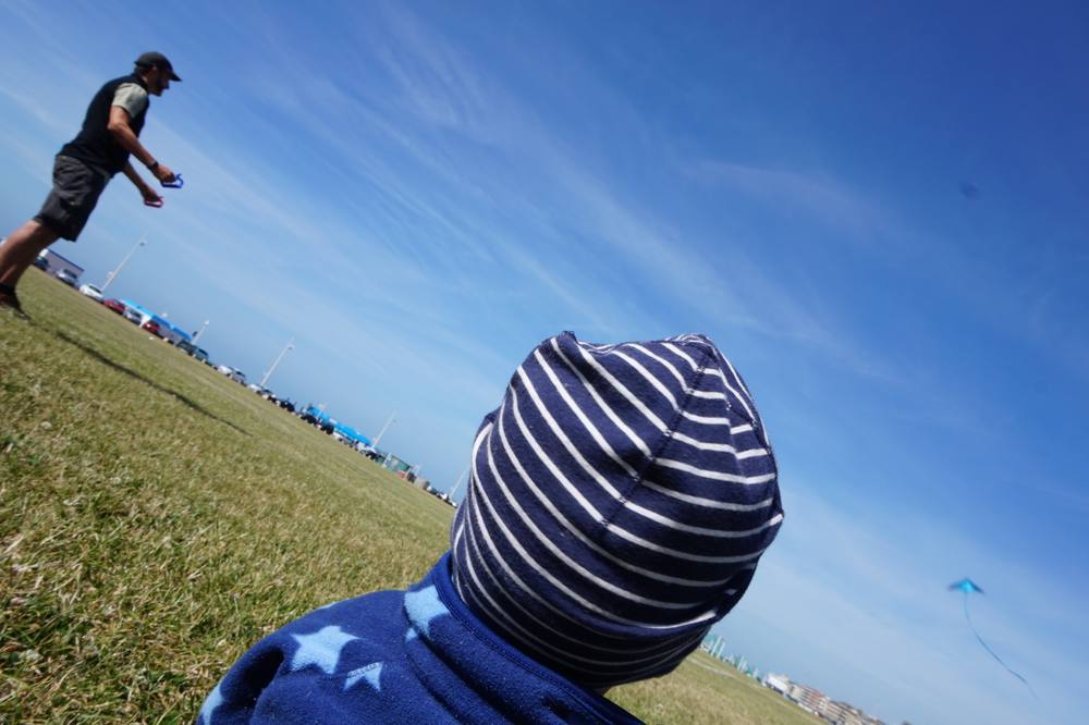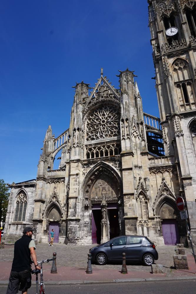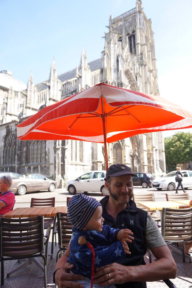 Also mussten wir bergauf über Straßen fahren mit durchgezogenen Linien, hinter uns wurde die geduldige Autoschlange immer länger, die die nicht so geduldig waren, überholten uns mit kamikazeartigen Manövern. Mir fiel einiges ein, worüber ich während der Fahrt schimpfte. Decathlon in der Ferne zu sehen war wie eine Fata Morgana. Der Laden selbst war schön kühl, kein Problem, hier konnten wir trocknen. Nach dem Drachenkauf weiter ins Zentrum von Dieppe zu fahren, war ähnlich abenteuerlich (obwohl wir uns auf einer Radroute befanden), besonders das letzte Stück, auf dem es eine lange Straße steil bergab ging. Ich sah vor mir den Kinderwagenanhänger bei jeder Unebenheit hüpfen, was meinen Mann nicht davon abhielt, richtig Fahrt aufzunehmen. Dieppe ist ein sehr hübsches Städtchen: direkt am großen Strand, davor eine große Wiese wie dazu gemacht, Drachen fliegen zu lassen, mit kleinem Hafen, wo sich nette Restaurants mit unfreundlichen Kellnern aneinander reihen und nicht zu vergessen die Kathedrale.