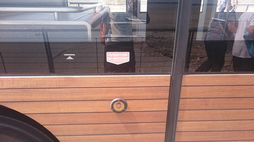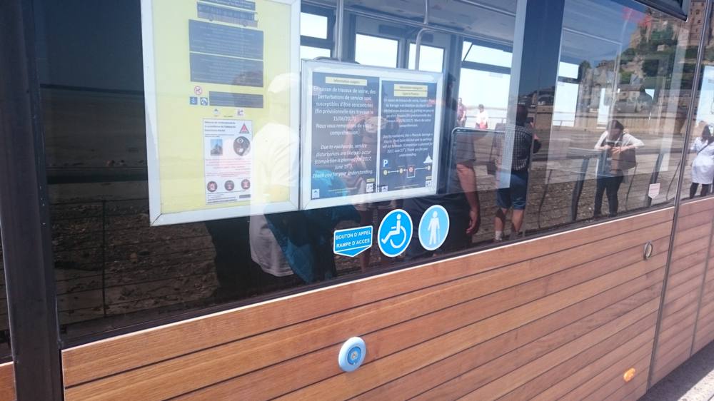 Denn wir haben in einem Wirrwarr von Baustellen und wenig Beschilderung erst an der eigentlichen Haltestelle auf den Pendelbus zur Insel gewartet. Dann hielt der nächste Pendelbus ein paar Meter in die entgegengesetzte Richtung, die Türen gingen aber nicht auf. Der Busfahrer verzog keine Mine und ließ uns vor der Tür stehen. Rechts war der blaue Knopf dem Rollstuhlfahrer, ist ja klar, dass Matthias den roten links vor sich drückt. Die Tür ging einen Spalt auf, es ist auch klar, dass man per Hand nachhilft… Bis der Busfahrerzwerg dem Vorhaben mit einem “Ohé, je me suis arrêté au feu rouge. L’arrêt c’est pas ici!” (Ich halte nur an der roten Ampel, die Haltestelle ist nicht hier) ein Ende setzte. Wild gestikulierend fügte er hinzu, dass man die Türen nicht mit Gewalt öffnen sollte. Matthias wich zurück, ich entschuldigte uns. Matthias hatte den Notknopf gedrückt.