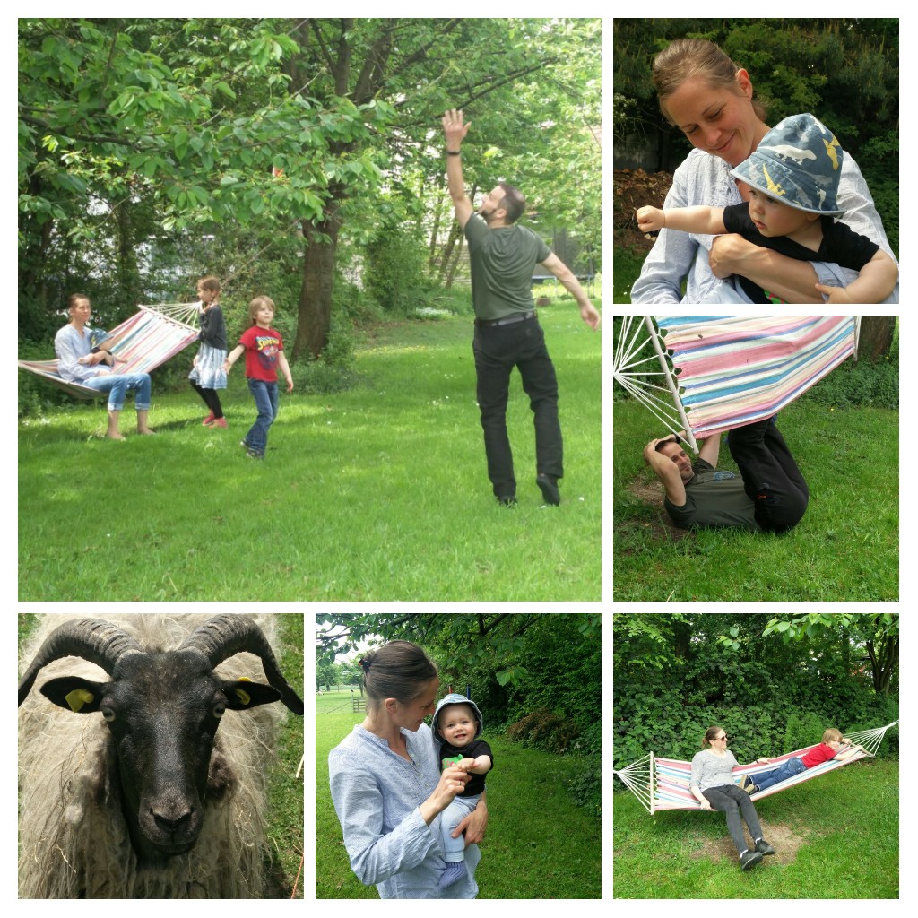 Frühstück im Sonnenschein und ab ins Erker Bad, direkt gegenüber der Europaschule Erkelenz (vielleicht den Lehrern ein Begriff)! In dem super Bad können Kinder und Erwachsene planschen, im Strudel treiben, im Babybecken Fontainen bestaunen, sich im Whirlpool aufwärmen und im kalten, großen Becken Bahnen ziehen. Wir kommen wieder! Bei unserer Rückkehr auf dem Kremer Hof, hörte Yili zum ersten Mal (?) die Schafe, als seine Tante ihn durch den Garten trug.